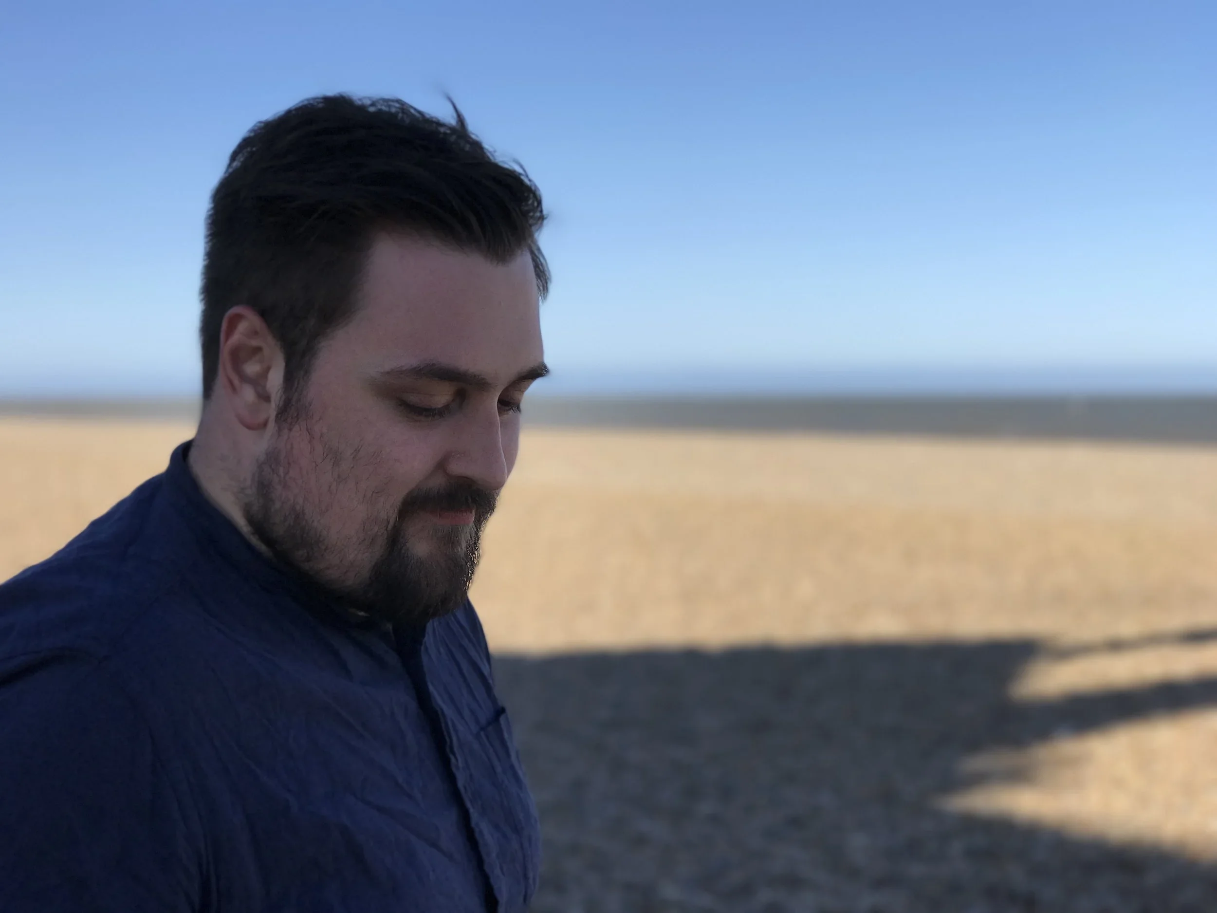 A man with dark hair and a beard looking down, standing on a beach with sand and the ocean in the background.